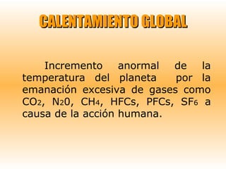 El calentamiento global es un aumento anormal de la temperatura terrestre causado por la emisión excesiva de gases de efecto invernadero, lo que resulta en una variedad de efectos perjudiciales como el aumento del nivel del mar y la alteración de ecosistemas. Estos cambios impactan negativamente en la biodiversidad, la producción de alimentos y los recursos hídricos. A largo plazo, se prevé un aumento significativo de la temperatura, con consecuencias devastadoras para el medio ambiente y la salud humana.