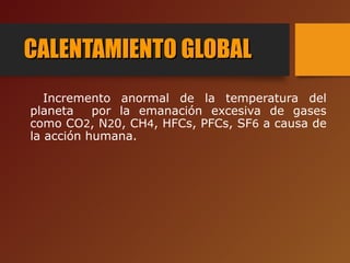 El documento describe el calentamiento global como el incremento anormal de la temperatura del planeta debido a la emanación excesiva de gases causantes del efecto invernadero por la acción humana. Explica que la capa de ozono protege la Tierra filtrando los rayos ultravioleta dañinos, pero que los gases emitidos están formando una capa que impide que el exceso de calor salga de la atmósfera y aumenta la temperatura del planeta. Finalmente, detalla algunos de los efectos que podría tener el calentamiento global, como la subida del n