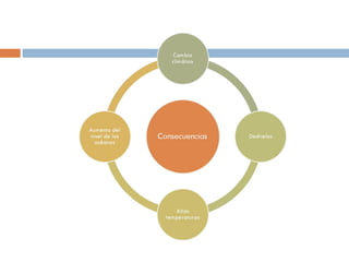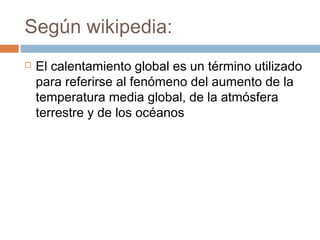 El documento resume el calentamiento global, explicando que es el aumento de la temperatura promedio de la Tierra debido al efecto invernadero natural. Sin embargo, el aumento en los gases de efecto invernadero como el CO2 y el metano debido a la quema de combustibles fósiles y la deforestación han intensificado este efecto, causando grandes consecuencias como desastres. Por lo tanto, debemos tomar iniciativas para reducir estas emisiones y proteger nuestro planeta.