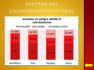 El documento explica que el aumento de la temperatura de la atmósfera y los océanos en las últimas décadas, conocido como calentamiento global, pone en gran riesgo a nuestro planeta. El calentamiento global ocurre cuando los contaminantes del aire atrapan el calor del sol en la atmósfera. Debemos reducir las emisiones de gases de efecto invernadero para evitar las graves consecuencias del calentamiento global como derretimiento de glaciares, huracanes más intensos y aumento del nivel del mar.