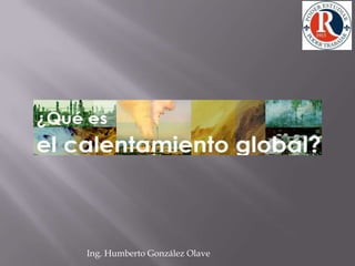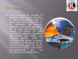 El documento discute el cambio climático causado por las emisiones humanas de gases de efecto invernadero. Explica que el efecto invernadero natural mantiene la temperatura de la Tierra habitable, pero que las emisiones desde la revolución industrial han acelerado el calentamiento global de forma preocupante. La comunidad internacional ha establecido el IPCC y el Protocolo de Kyoto para abordar este problema, pero los esfuerzos continúan siendo insuficientes, poniendo en peligro la vida en la Tierra. Se necesitan acciones urgentes