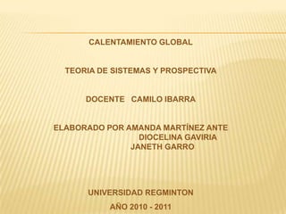 El documento habla sobre el calentamiento global, sus causas como el aumento de gases de efecto invernadero debido a la actividad humana, y sus consecuencias como el aumento de temperaturas, nivel del mar y enfermedades. También describe los impactos en la calidad del agua, ecosistemas, agricultura, flora y fauna; y medidas para reducir las emisiones de gases y mitigar sus efectos.