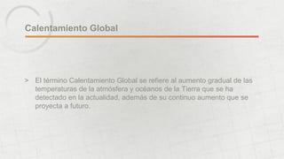 El documento habla sobre el calentamiento global. Explica que es un aumento gradual de las temperaturas de la atmósfera y los océanos causado principalmente por la quema de combustibles fósiles y la deforestación, lo que emite dióxido de carbono. Algunas consecuencias del calentamiento global incluyen el aumento del nivel del mar, cambios en los ecosistemas, y la extinción de especies animales y vegetales.