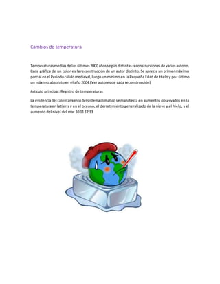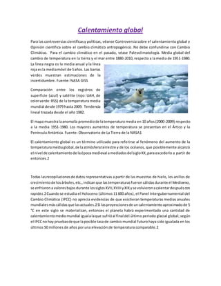 El documento describe el calentamiento global y sus efectos. Explica que la temperatura media global ha aumentado 0.74°C desde 1906, con el calentamiento más rápido en las últimas décadas. Los registros muestran que los 13 años más cálidos han ocurrido desde 2001. Además, el derretimiento de glaciares y casquetes polares ha causado que el nivel del mar suba 19cm desde 1900. Los océanos han absorbido gran parte del exceso de calor, pero siguen atrapando calor.