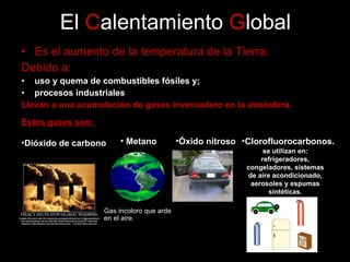 El documento describe el calentamiento global y el efecto invernadero. Explica que el aumento de gases invernadero como el dióxido de carbono y el metano en la atmósfera están atrapando más calor de la radiación solar, causando que la temperatura global aumente. Algunas consecuencias incluyen el aumento del nivel del mar, enfermedades, escasez de alimentos, y extinción de especies.