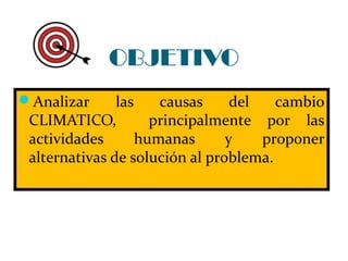 Este documento analiza las causas y consecuencias del cambio climático causado principalmente por las actividades humanas. Explica que el calentamiento global está causando el derretimiento de los casquetes polares, tormentas más intensas, inundaciones costeras e incendios forestales, poniendo en riesgo a especies como osos polares, tigres de Bengala, canguros y pingüinos. Finalmente, propone alternativas como mejorar la eficiencia energética, el reciclaje y evitar el desperdicio para enfrentar el problema.