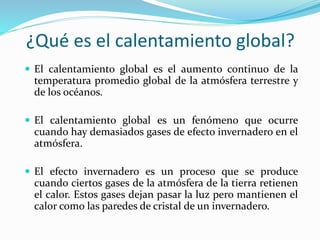 El documento explica que el calentamiento global es el aumento continuo de la temperatura promedio global debido a los gases de efecto invernadero en la atmósfera. Estos gases, como el dióxido de carbono, atrapan el calor similar a un invernadero. Las principales causas son la quema de combustibles fósiles y la deforestación, mientras que las consecuencias incluyen el aumento del nivel del mar, cambios en los ecosistemas y desastres climáticos. Algunas soluciones propuestas son mejorar la eficiencia