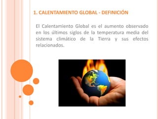 El documento habla sobre el calentamiento global, definiéndolo como el aumento observado en las últimas décadas de la temperatura media del planeta. Explica que las principales causas son el uso de combustibles fósiles y la destrucción de bosques, los cuales emiten dióxido de carbono a la atmósfera. Algunos efectos son el aumento del nivel del mar, escasez de agua dulce y propagación de enfermedades. Finalmente, menciona organizaciones involucradas en el tema y formas de prevención como usar energías