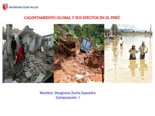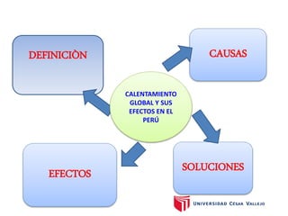 El documento habla sobre el calentamiento global y sus efectos en el Perú. Define el calentamiento global como el aumento de la temperatura promedio de la atmósfera y los océanos debido a la actividad humana, principalmente las emisiones de CO2. Explica las causas como fertilizantes, ganado, maquinaria agrícola. Los efectos incluyen pérdida de biodiversidad, desastres, problemas de agua y agricultura en el Perú. Las soluciones mencionadas son protocolos internacionales y la respuesta del Perú a través