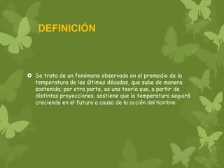 El calentamiento global en Perú se manifiesta a través del aumento sostenido de temperaturas, causado principalmente por el uso de combustibles fósiles y la deforestación, afectando el medio ambiente y la disponibilidad de agua. Sus efectos incluyen el retroceso de glaciares, desastres naturales, y la pérdida de biodiversidad, así como impactos económicos negativos. Se proponen medidas de prevención que involucran acciones individuales y la colaboración de organismos internacionales para mitigar el impacto del calentamiento global.