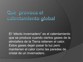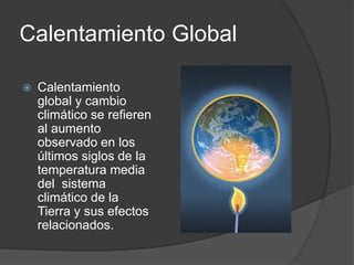 El documento describe el calentamiento global y cambio climático, explicando que los gases de efecto invernadero atrapan el calor en la atmósfera causando un aumento de las temperaturas globales. También señala que aunque hay ciclos naturales, la actividad humana como la producción de gases, deforestación y urbanización están acelerando el calentamiento, lo que está cambiando los patrones climáticos y derritiendo el hielo con consecuencias como el aumento del nivel del mar. El documento sugiere formas de reducir el impact