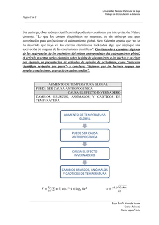 El calentamiento global se refiere al aumento de la temperatura media global y de los océanos desde 1850. Este incremento se ha acentuado en las últimas décadas del siglo XX y la primera del XXI. El calentamiento global está asociado a un cambio climático que puede deberse a causas naturales o antropogénicas, y su principal efecto es el efecto invernadero causado por gases como el CO2.