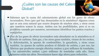 El calentamiento global es el aumento gradual de las temperaturas en la atmósfera y océanos, impulsado principalmente por los gases de efecto invernadero como el dióxido de carbono, generados por actividades humanas como la quema de combustibles y la deforestación. Esto provoca efectos perjudiciales, como el derretimiento de glaciares, la acidificación de océanos y un incremento de incendios forestales y tormentas intensas. Para mitigar estos impactos, se sugieren acciones como mejorar la eficiencia energética, reducir el uso de agua caliente y fomentar el reciclaje.