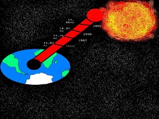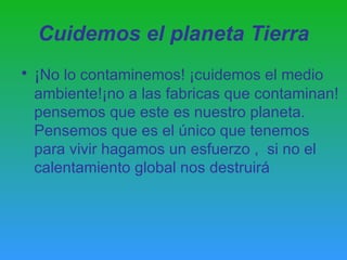 El documento habla sobre el calentamiento global y la necesidad de cuidar el planeta Tierra y el medio ambiente, sugiriendo no contaminar y pensar que este es el único planeta que tenemos para vivir, y que si no hacemos un esfuerzo para detener el calentamiento global este nos destruirá.