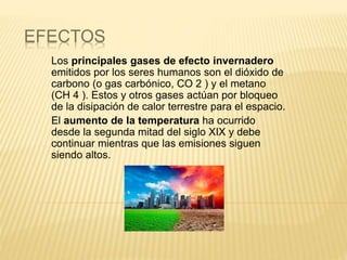 El documento habla sobre el calentamiento global. Explica que es el aumento de la temperatura promedio de la Tierra causado principalmente por las emisiones de gases de efecto invernadero como el dióxido de carbono y el metano producidas por actividades humanas como la quema de combustibles fósiles. También menciona que los principales efectos son el aumento de la temperatura desde la segunda mitad del siglo XIX y problemas ambientales si las emisiones siguen siendo altas.