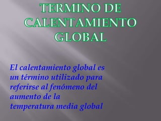 El documento describe el calentamiento global como el aumento de la temperatura media global debido al efecto invernadero de los gases en la atmósfera. Explica que la evidencia incluye aumentos en las temperaturas del aire y océanos y el derretimiento de nieve y hielo. Los efectos negativos del calentamiento global incluyen la destrucción de bosques, contaminación de ríos y mares, sequías, tormentas más intensas y cambios en los ecosistemas que amenazan a las especies.