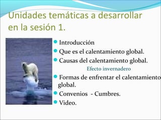 El documento resume las unidades temáticas a tratar en una sesión sobre el calentamiento global, incluyendo introducciones al tema, causas como el efecto invernadero, y formas de enfrentarlo. Explica que el calentamiento global se refiere al aumento de la temperatura promedio global debido a actividades humanas, y analiza sus posibles impactos en la salud humana y el medio ambiente. También describe estrategias para mitigarlo como mejorar la eficiencia energética, vehículos más sostenibles, y expandir el uso de energías renov
