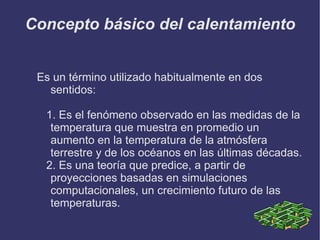 El documento resume las causas y efectos del calentamiento global. Explica que la temperatura de la Tierra ha aumentado desde la Revolución Industrial debido a las emisiones de gases de efecto invernadero. Si bien el clima varía naturalmente, la mayoría de expertos concuerdan en que la actividad humana ha exacerbado el calentamiento en las últimas décadas. De no reducirse las emisiones, se prevé que la temperatura global continuará elevándose con consecuencias negativas como el deshielo, el aumento del nivel del mar y eventos clim