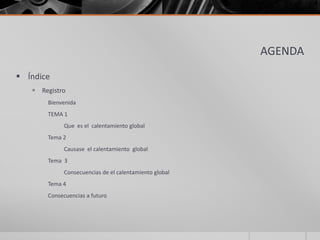 El documento habla sobre el calentamiento global. Explica que desde fines del siglo 19 se ha observado un aumento gradual de la temperatura promedio de la superficie del planeta entre 0.5 y 1°C, siendo los diez años más calientes entre 1985 y 2000. Las principales causas son los gases de efecto invernadero como el CO2 reteniendo radiación solar en la atmósfera. Algunas consecuencias son cambios en los patrones de precipitación y corrientes marinas, afectando ecosistemas terrestres y posiblemente dejando más áreas