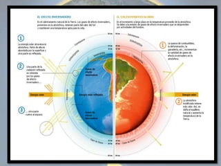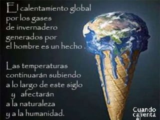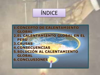 Este documento trata sobre el calentamiento global. Explica que existe un consenso científico de que el cambio climático alterará significativamente el clima global en el siglo XXI debido al aumento de gases de efecto invernadero como el dióxido de carbono. También analiza las causas y consecuencias del calentamiento global en el Perú y en el mundo, así como posibles soluciones como reducir la contaminación en un 60% para 2050 a través de estrategias como energías renovables.