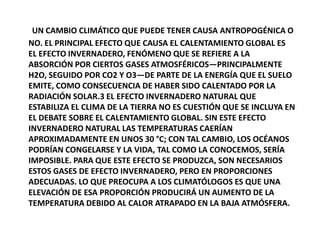 Este documento discute el efecto invernadero y su papel en el calentamiento global. Explica que ciertos gases como el vapor de agua, dióxido de carbono y ozono atrapan parte del calor emitido por la Tierra, creando un efecto invernadero natural que mantiene las temperaturas estables. Sin embargo, un aumento en los niveles de estos gases debido a la actividad humana podría causar un aumento de las temperaturas globales. El documento también presenta gráficos que muestran variaciones de temperatura en los últimos
