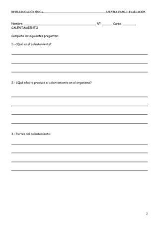 El documento habla sobre el calentamiento antes del ejercicio físico. Explica que el calentamiento prepara el cuerpo para el esfuerzo mediante el aumento de la temperatura, frecuencia cardíaca y respiratoria. Se divide en cuatro partes: ejercicios de desplazamiento, movilidad articular, estiramiento y calentamiento específico para la actividad a realizar.