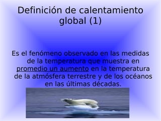 El documento define el calentamiento global como el aumento promedio de la temperatura de la atmósfera y los océanos observado en las últimas décadas, mientras que el efecto invernadero retiene parte de la energía emitida por la Tierra. Algunos efectos potenciales del calentamiento global incluyen el aumento del nivel del mar, cambios en los ecosistemas y la expansión de enfermedades tropicales.