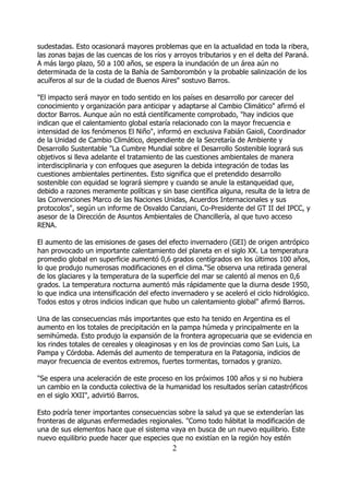Este documento resume las posibles consecuencias e impactos del cambio climático en Argentina y la región según varios especialistas. Se espera un aumento de las precipitaciones, eventos extremos, y temperaturas, lo que afectará la agricultura, salud y países en desarrollo. Los mayores emisores de gases de efecto invernadero son los países desarrollados.