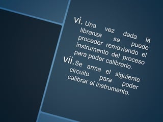 El documento describe un procedimiento de calibración a manómetro de presión. Se utiliza un circuito que incluye un manómetro, una válvula y una bomba para generar diferentes niveles de presión y comparar las lecturas del manómetro con un manómetro de referencia para asegurar la precisión de las mediciones.