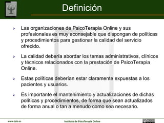 Este documento discute la importancia de la gestión de la calidad para las organizaciones de psicoterapia en línea. Recomienda que las organizaciones establezcan políticas y procedimientos claros relacionados con aspectos administrativos, clínicos y técnicos para mejorar la satisfacción del paciente, reducir riesgos legales y diferenciarse de la competencia. Además, sugiere revisar las políticas anualmente y considerar auditorías de calidad en el futuro.
