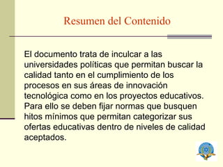 El documento argumenta que las universidades deben establecer políticas y normas para buscar la calidad tanto en sus procesos de innovación tecnológica como en sus proyectos educativos a distancia. Deberían fijar estándares mínimos para categorizar sus ofertas educativas en niveles de calidad aceptados e incrementar la formación docente en TIC. También propone que se consensuen normas para regular los proyectos educativos a distancia y se asegure la infraestructura, soporte y evaluación necesarios.