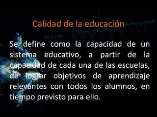 Este documento discute la importancia de una educación intercultural de calidad. Explica que la calidad educativa se define por la capacidad del sistema para lograr objetivos de aprendizaje con todos los estudiantes. Luego enumera elementos clave para una educación intercultural de calidad como la participación comunitaria, cultura escolar, liderazgo, currículo y procesos de enseñanza. Finalmente, plantea preguntas sobre por qué la práctica docente tiene consecuencias sociales e históricas, por qué es importante considerar el contexto sociopolí