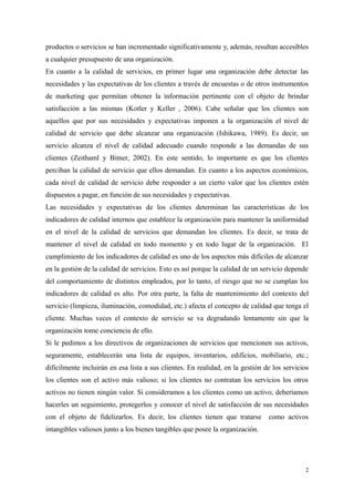 El documento explora la importancia de la calidad de servicio en organizaciones educativas, destacando la necesidad de entender las expectativas de los alumnos como clientes y la aplicación de principios de marketing de servicios. Se discuten diferentes tipos de calidad, las brechas en la percepción del servicio y la influencia de los momentos de la verdad en la satisfacción del cliente. Además, se subraya que los recursos humanos son clave para ofrecer servicios de alta calidad y la gestión efectiva de estos momentos es esencial para la lealtad del cliente.