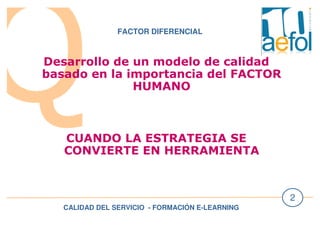 El documento presenta un decálogo de 10 puntos para garantizar la calidad en la formación e-learning desde la perspectiva del usuario/alumno. Incluye factores como una planificación rigurosa de los procesos formativos, contenidos de calidad, requerimientos técnicos adecuados, y actores cualificados. También destaca la necesidad de proporcionar satisfacción al cliente a través de servicios como soporte técnico, seguimiento del aprendizaje, y confidencialidad.