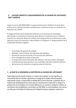El documento presenta tres definiciones de calidad de software: como características y atributos de un producto, como conjunto de cualidades, y como desarrollo de un producto económico, útil y satisfactorio para el consumidor. También describe el aseguramiento de calidad como actividades planificadas para garantizar que el software cumpla los requisitos, e incluye revisiones técnicas y pruebas como ejemplos. Por último, explica que la gestión de calidad sigue normas como ISO 9001 para supervisar y mejorar la producción a trav