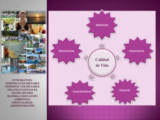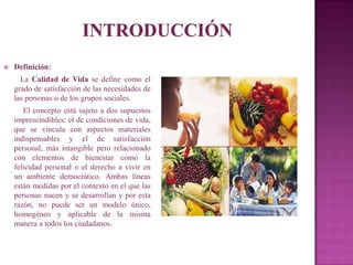 La calidad de vida se define como el grado de satisfacción de las necesidades de las personas y grupos sociales. Está determinada por factores materiales como condiciones de vida e intangibles como felicidad personal. Se mide considerando el contexto donde las personas nacen y se desarrollan. La calidad de vida es importante para el bienestar personal y social e incluye dimensiones físicas, psicológicas y sociales que comprenden la salud, estado cognitivo y afectivo, y relaciones interpersonales respectivamente.