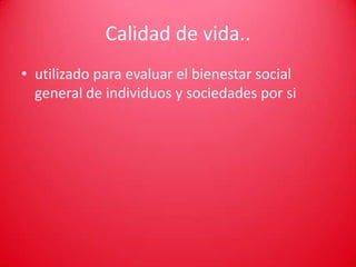 El documento trata sobre varios temas relacionados con la calidad de vida y el final de la vida. Explica que la calidad de vida se usa para evaluar el bienestar social y que los cirujanos deben considerarla al tomar decisiones quirúrgicas. También describe la donación de órganos como un procedimiento para trasplantar tejidos sanos y mantener la calidad de vida, así como conceptos como la eutanasia, el derecho a morir dignamente y las directivas anticipadas de no reanimación.