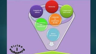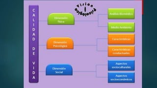 El documento discute el origen y definición de la dimensión psicológica de la calidad de vida. Se remonta a décadas atrás cuando la psicología comenzó a enfocarse en las características psicológicas y de comportamiento que afectan la salud. Incluye conceptos como satisfacción vital, normas éticas y la capacidad de relacionarse con los demás. La calidad de vida psicológica varía según el entorno social.