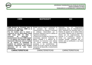 Este documento presenta una tabla comparativa de los modelos ISO, CMMI, MOPROSOFT y factores de calidad de software. Resume las características, ventajas y desventajas de cada modelo y describe factores como funcionalidad, portabilidad, corrección, confiabilidad y otros. El autor es José Jonathan Torres Castillo de la Universidad Tecnológica del Estado de Zacatecas.
