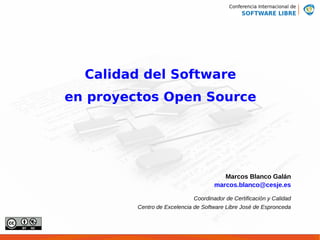 Este documento describe la calidad del software en proyectos de código abierto. Discutió la definición de calidad del software, los modelos de calidad de productos y procesos, y las métricas para evaluar la calidad. También mencionó dos iniciativas, FLOSSMetrics y Qualoss, que buscan medir automáticamente la calidad de proyectos de código abierto mediante el análisis de código fuente y datos de repositorios.