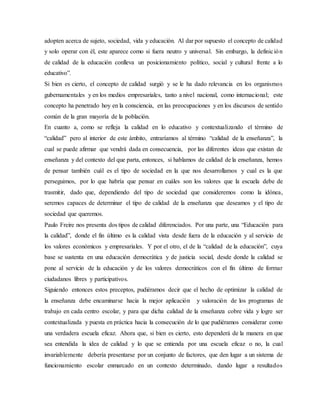 Este documento analiza críticamente los problemas que inhiben el aseguramiento de la calidad en las instituciones educativas. Reflexiona sobre cómo se define la calidad, cómo se refleja en la educación y cuáles son los principales retos para lograr instituciones educativas de calidad. Identifica factores como la pobreza, el desempleo y la falta de formación docente continua como problemas que afectan negativamente la calidad. Concluye que la calidad educativa debe enfocarse en formar ciudadanos críticos y participativos, no solo en
