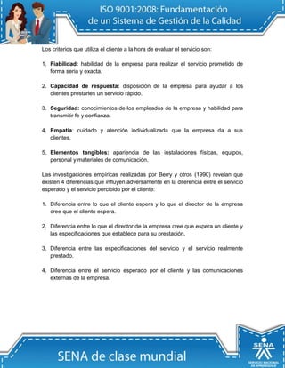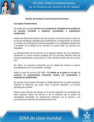 El documento describe los conceptos fundamentales de la gestión de calidad en las empresas de servicios. Explica que los servicios son intangibles y heterogéneos, y que su calidad se genera simultáneamente con su prestación. La calidad de un servicio se puede cuantificar mediante la diferencia entre el servicio esperado y percibido por el cliente. El documento también presenta modelos conceptuales para medir y mejorar continuamente la calidad del servicio.