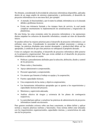Este artículo presenta los cinco elementos fundamentales para el desarrollo de proyectos informáticos de calidad: Personas, Procesos, Productos/Servicios, Información y Herramientas. Discute que cada elemento es importante y que deben estar equilibrados para el éxito del proyecto, ya que los cambios en un elemento afectan a los demás. También describe cada elemento y por qué son importantes para el desarrollo del proyecto.