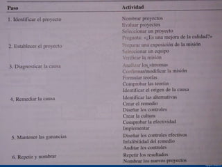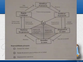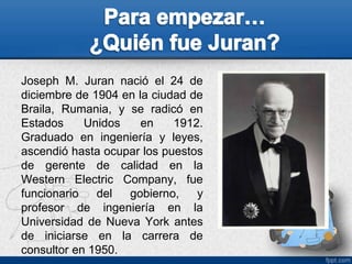 El documento describe las contribuciones de Joseph M. Juran a la gestión de la calidad. Juran definió la calidad como "adecuación para el uso" y desarrolló la "trilogía de la calidad" que incluye la planeación, el control y la mejora de la calidad. También propuso el concepto de cliente interno y desarrolló un proceso de seis fases para la solución de problemas relacionados con la calidad. Juran tuvo una gran influencia en la revolución de la calidad en Japón y fundó el Instituto Juran para capac