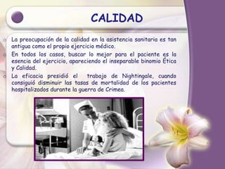 El documento aborda la importancia de la calidad en la atención de enfermería, resaltando la necesidad de garantizar una asistencia oportuna y ética que satisfaga las expectativas del paciente. Se discuten los círculos de calidad y la documentación adecuada como herramientas fundamentales para mejorar la atención y controlar la calidad en la asistencia sanitaria. También se subraya la responsabilidad de los profesionales de enfermería en la correcta comunicación y registro de información relevante sobre el estado de salud de los pacientes.