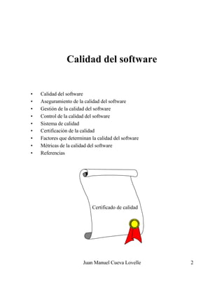 Este documento presenta una conferencia sobre calidad de software. Cubre temas como definiciones de calidad de software, aseguramiento de calidad, gestión de calidad, control de calidad, sistemas de calidad, certificación de calidad, métricas de calidad y factores que determinan la calidad de software. El documento proporciona una introducción general a estos conceptos clave relacionados con la calidad de software.