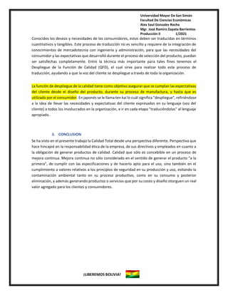 El documento define la calidad total como un compromiso ético con la excelencia que requiere que una empresa genere productos y servicios de alta calidad como un objetivo estratégico para mantener la competitividad. Explica que los clientes definen la calidad y que las empresas deben satisfacer sus necesidades actuales y futuras. También destaca la importancia de la investigación de mercado, inteligencia competitiva y benchmarking para traducir las necesidades de los clientes en especificaciones de productos a través de técnicas como el despliegue de la función de calidad.
