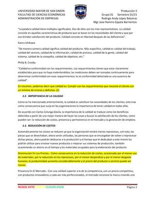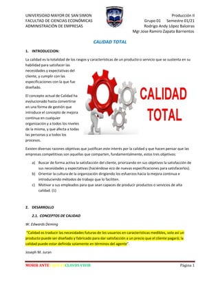 El documento aborda la importancia de la calidad en productos y servicios, destacando que su definición se centra en la satisfacción de las necesidades del cliente y en la mejora continua dentro de las organizaciones. Se mencionan diferentes filosofías y principios de calidad de expertos en el campo, así como los beneficios que la calidad aporta a las empresas, como reducción de costos y generación de empleo. Finalmente, se concluye que cumplir con los estándares de calidad es esencial para competir en un mercado exigente, promoviendo la satisfacción del cliente y la mejora de procesos.