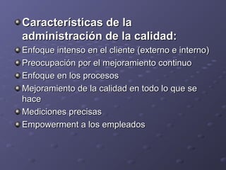 El documento habla sobre la administración de la calidad total y los principios de W. Edwards Deming. Algunos de los principios clave de Deming incluyen enfocarse en la mejora continua, eliminar la inspección masiva, establecer relaciones a largo plazo con proveedores confiables, y promover el aprendizaje y capacitación en el lugar de trabajo. La administración de la calidad total también se enfoca en satisfacer las necesidades de los clientes y en mejorar procesos a través de mediciones precisas.