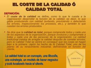 El documento proporciona definiciones y conceptos clave relacionados con el coste de la calidad total. Explica que el coste de la calidad incluye los costes de prevención, evaluación, errores internos y externos. También resume las contribuciones de figuras influyentes como Deming, Ishikawa y Crosby a la evolución del concepto de calidad total.